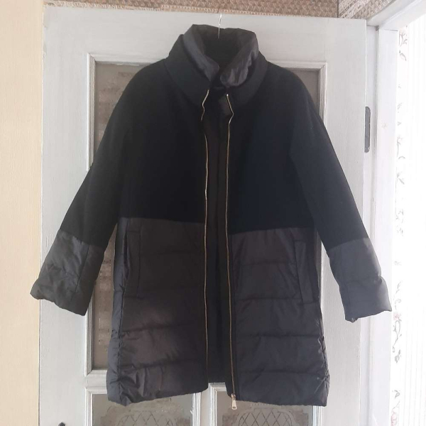 Labai graži tamsiai mėlyna MANGO pūkinė striukė, maišyta su paltine medžiaga. Ten kur paltinė medžiaga šiek tiek pūkuojasi, reikia vis pasivalyt su pukų surinkėju