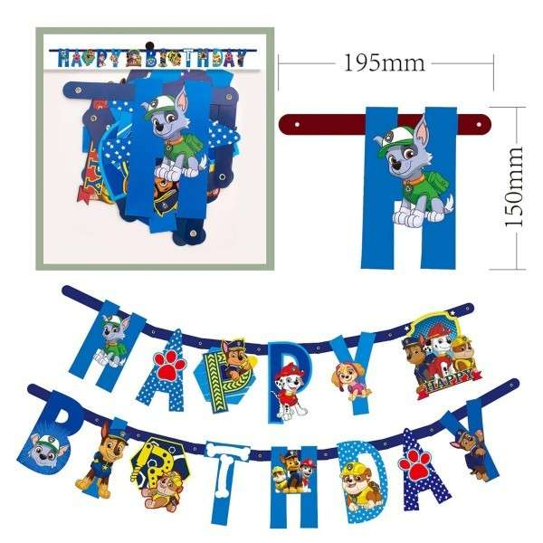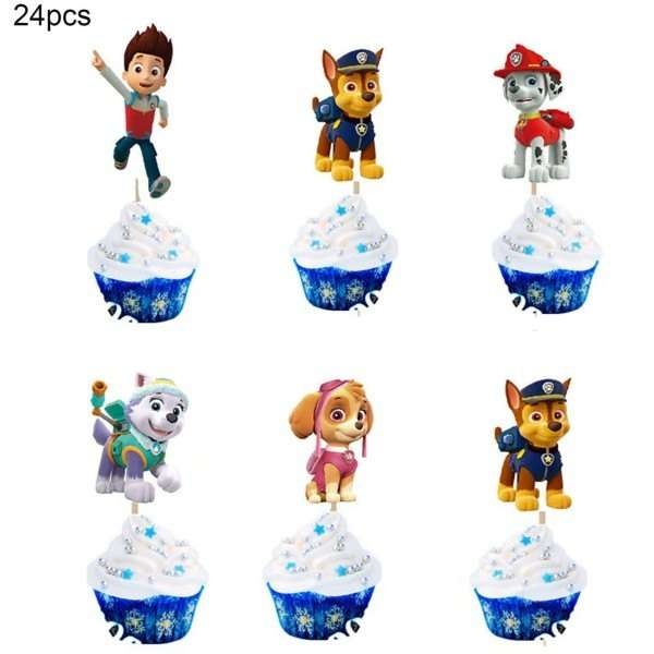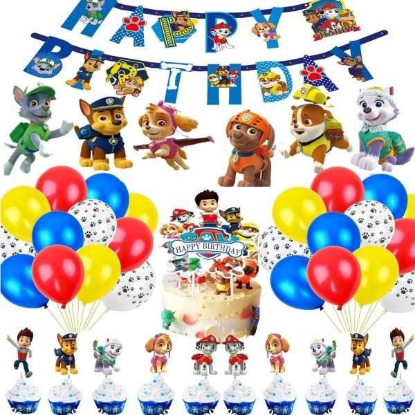 Šunyčių patrulių komplektas: 40 balionų, 24 keksiukų smaigtukų, ant torto papuošimas ir Happy birthday užrašas su šunyčiais patruliais.