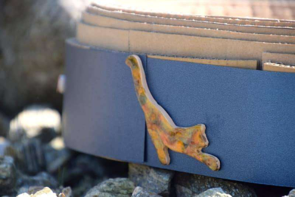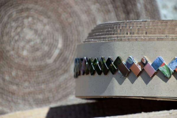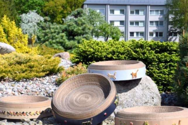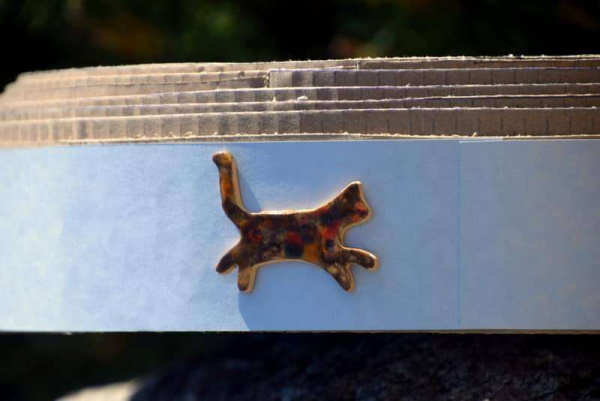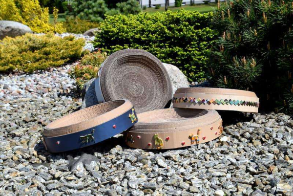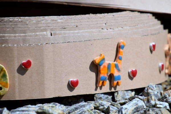 Kartoninė kačių draskyklė dekoruota keramikos elementais