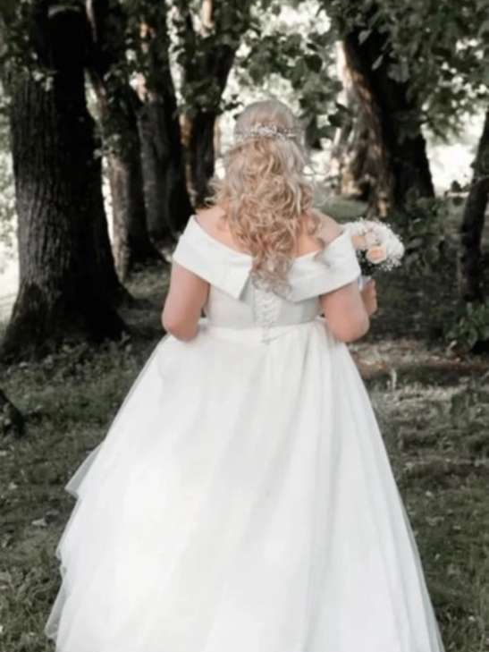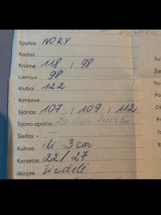 Siūta pagal individualų užsakymą, matmenys paskutinėje nuotraukoje, korsetas reguliuojasi, susiriša raišteliais. Mano ūgis 164cm. Suknelė apšvietus labai gražiai blizga. Yra skeltukas, jis susisega sagutėmis, tad jei nori, susegi ir jo nesimato. Suknelė išvalyta. Dovanų pridedu vualį (kitaip nuometą, iki žemės) ir pasijonį su lanksčiu lanku, juos reikės išsivalyti. Kainą galime paderinti. Galima pasimatuoti Vilniuje arba Molėtuose.
