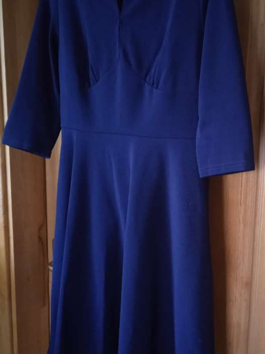 Puošni, gražia apykakle, įlemenuota suknelė, turi tamprumo. Nugarinėje dalyje užtrauktukas. Rankovės trijų ketvirčių. Ilgis- iki kelių. Tinkama nešiojančioms L-XL dydį.
