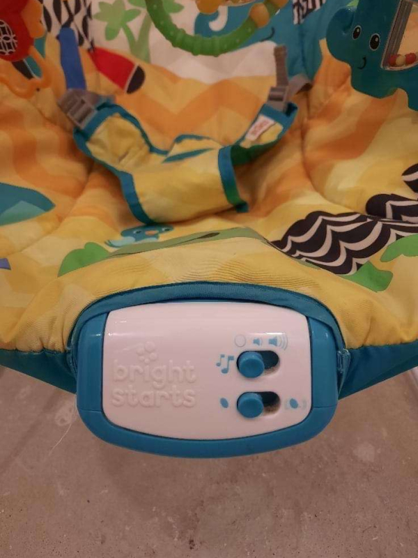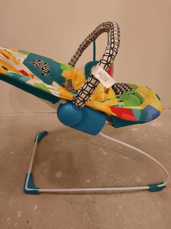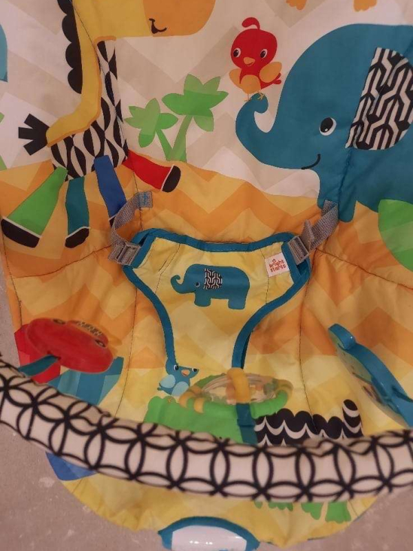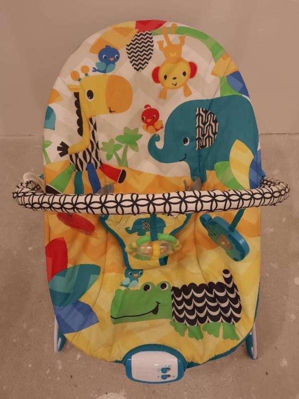 Spyruokliuojantis gultukas-vibro kėdutė "Safari". Skirtas nuo 3-9kg. Yra nuimamas lankas su 3 pakabinamais žaisliukais (žaisliukai nenusiima). Malonus vibravimas, 7 melodijos. Saugos dirželiai, lengvas,todėl lengva transportuoti. Minkštas, malonus prisilietimui audinys. Nuimamą užvalkalą galima skalbti.