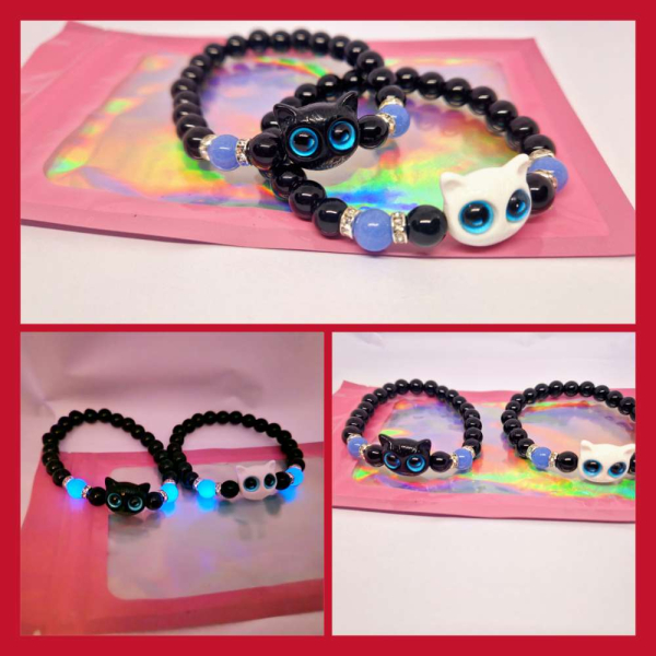 Naujų apyrankių rinkinys porai ar draugams + maišelis . 8mm karoliukai , mėlyni karoliukai tamsoje šviečia mėlyna spalva . Kačiuko karoliukas mėlynomis akytėmis .