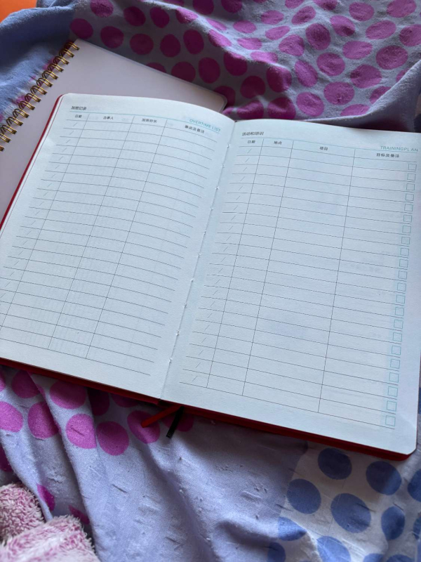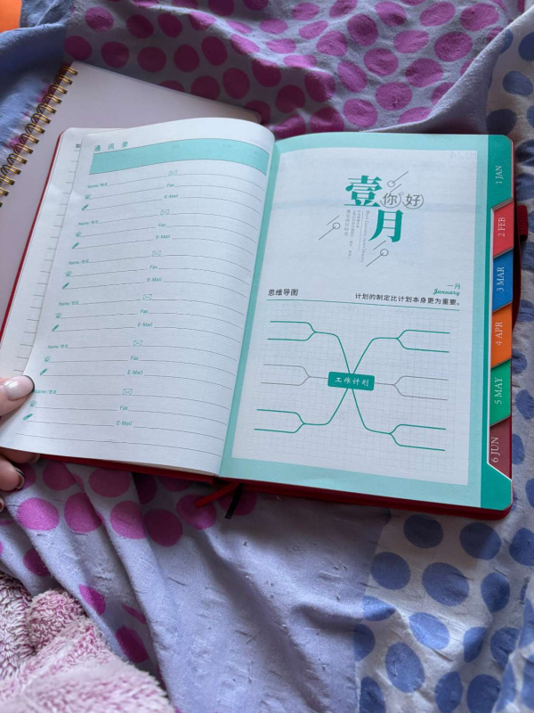 📕 Raudonas kietu viršeliu su elastine juostele – tvarkingas, išskirtinio dizaino planuoklis su skyriais kiekvienam mėnesiui (užrašai anglų ir kinų kalbomis).